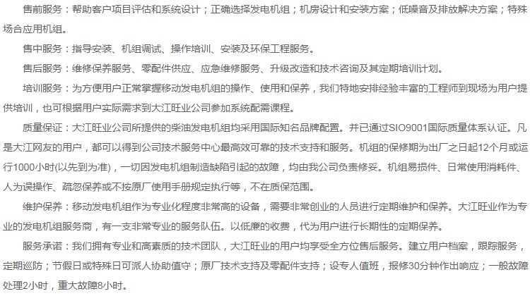 大江旺業提供各種型號規格移動發電機組銷售、出租、維修、保養及安裝服務,信譽保證,價格公道,歡迎新老客戶來電咨詢。